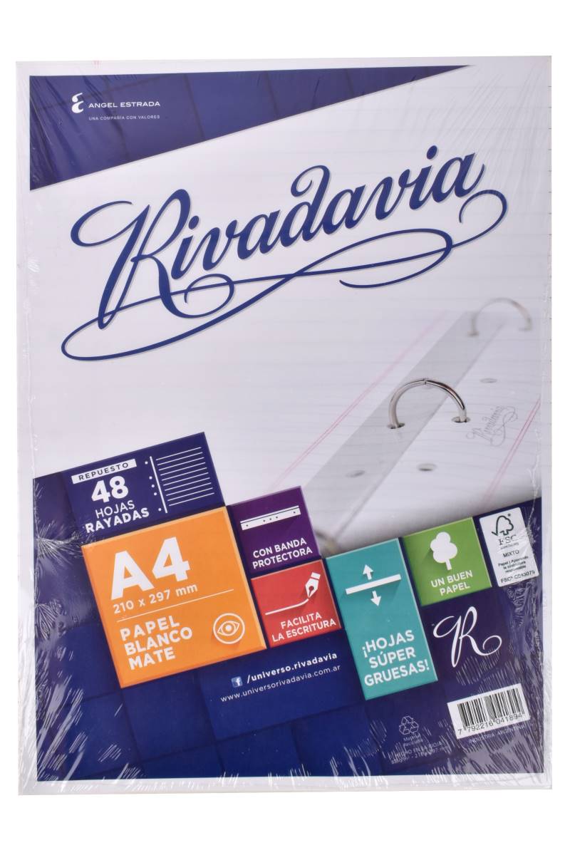 Repuesto A4 Rivadavia 48 hojas rayadas de papel blanco mate, ideal para carpetas escolares y de oficina. Práctico y funcional. Cómpralo en Ferniplast.com