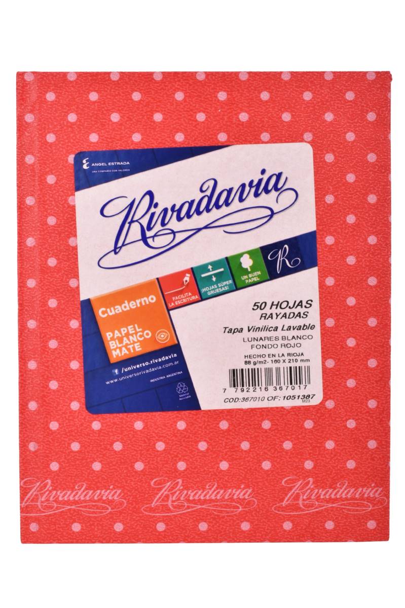 Cuaderno Rivadavia tapa dura rayado lunar rojo de 50 hojas, con papel blanco mate y tapa vinílica lavable. Ideal para la escuela. Cómpralo en Ferniplast.com