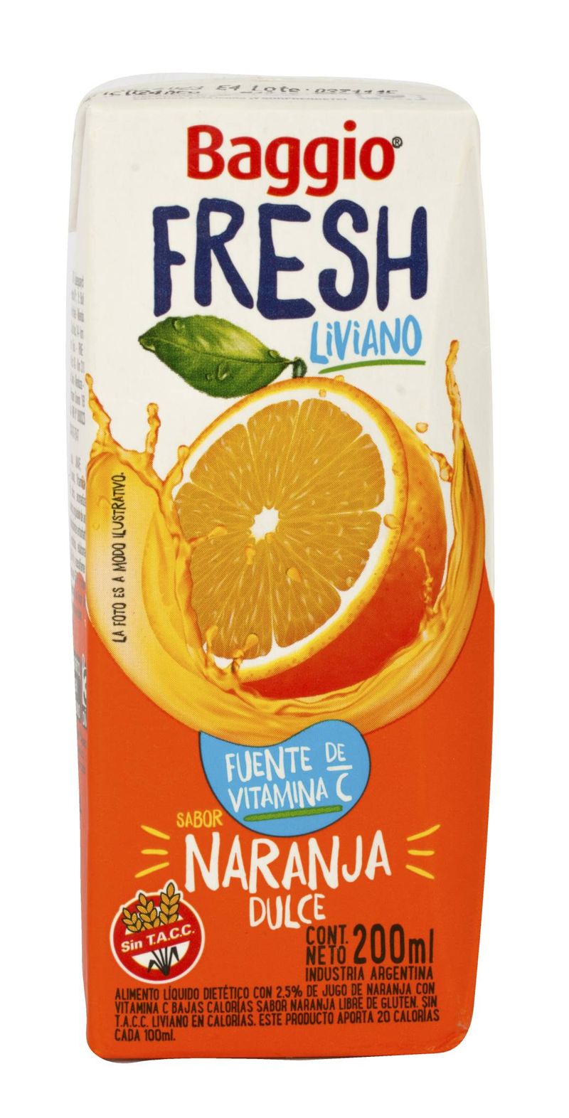 Jugo Baggio Fresh sabor naranja dulce. Fuente de vitamina C y libre de gluten. ¡Perfecto para hidratarte con un delicioso jugo sabor a frutas!