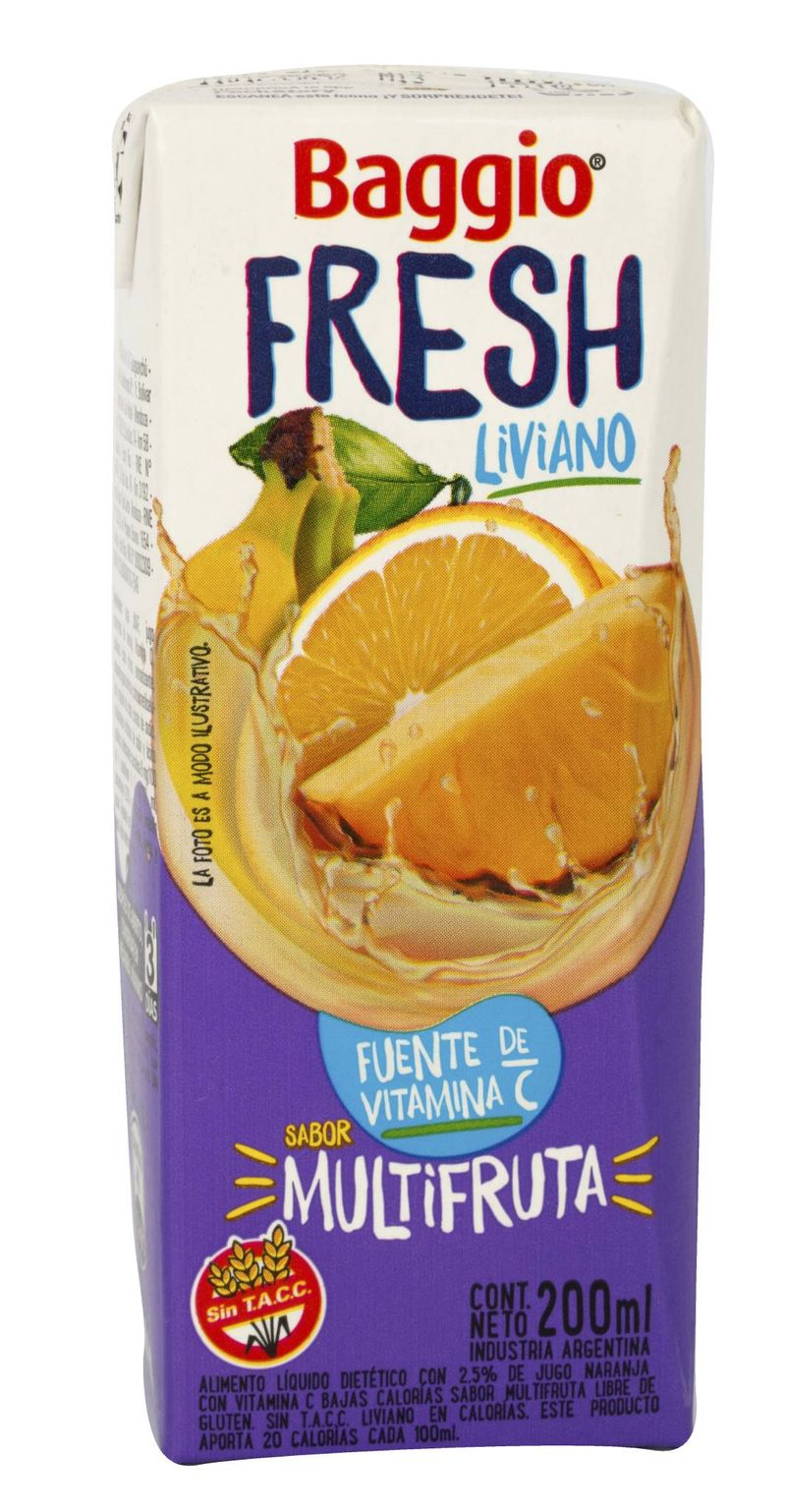 Jugo Baggio Fresh sabor multifruta. Fuente de vitamina C y libre de gluten. ¡Perfecto para hidratarte con un delicioso jugo sabor a frutas!