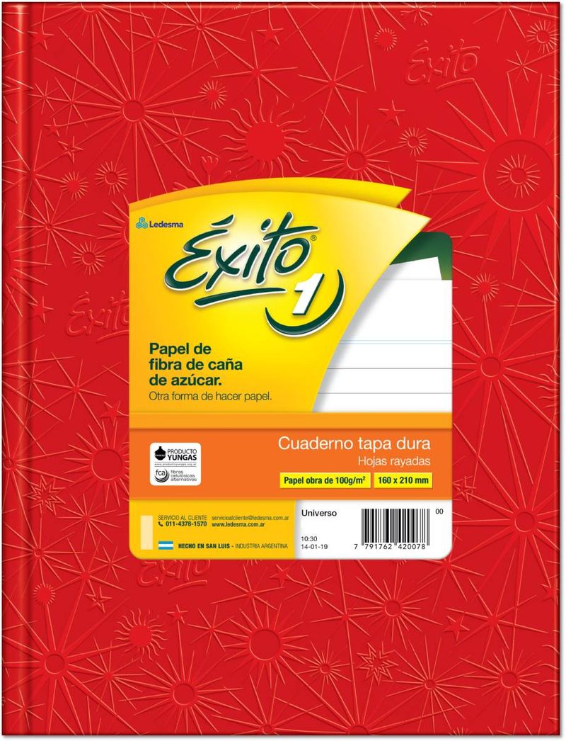 Cuaderno Éxito Nº1, contiene 48 hojas rayadas, tapa dura de cartón y formato de 160 x 210 mm de primera calidad.