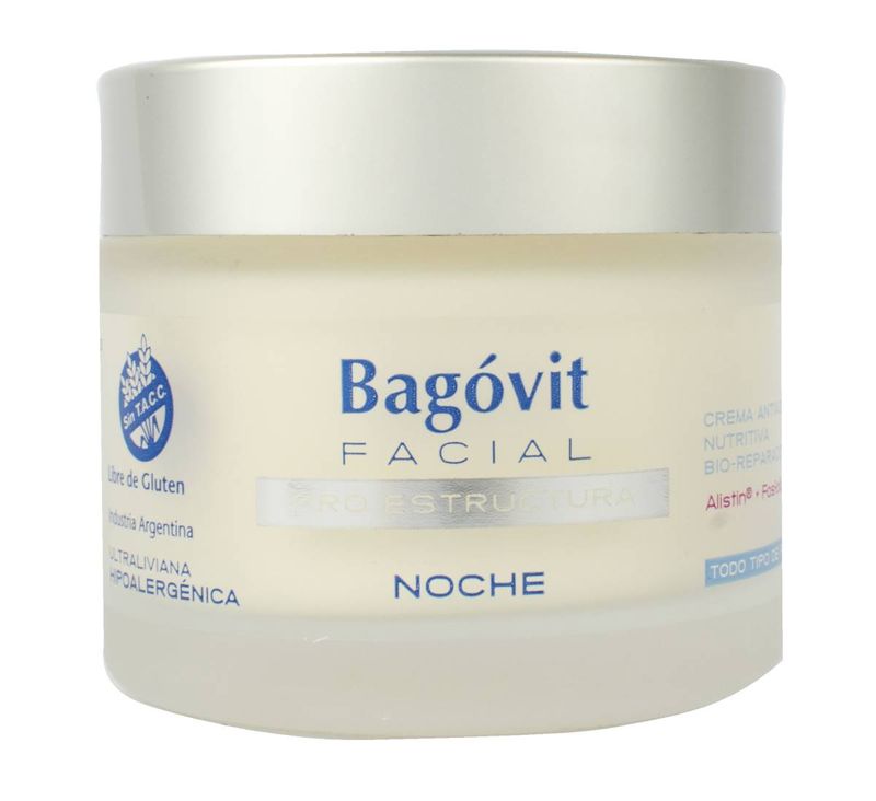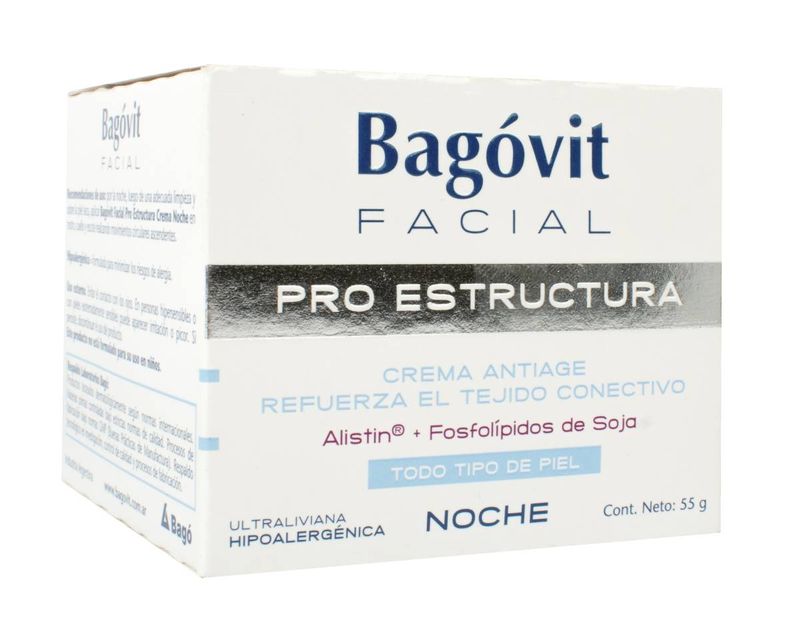 Crema facial Bagovit pro estructura Noche. Su exclusiva fórmula ultra liviana de eficacia comprobada clínica y dermatológicamente, atenúa los efectos del paso del tiempo en la piel, estimulando las células productoras de colágeno y restableciendo la elasticidad.