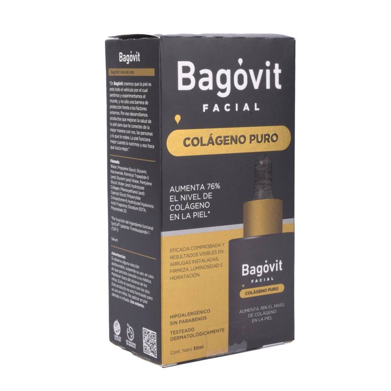 Sérum Bagóvit Colágeno Puro 30ml. Aumenta 76% el colágeno. Reduce arrugas instaladas, reafirma e ilumina la piel. ¡Eficacia comprobada! Cómpralo en Ferniplast.com