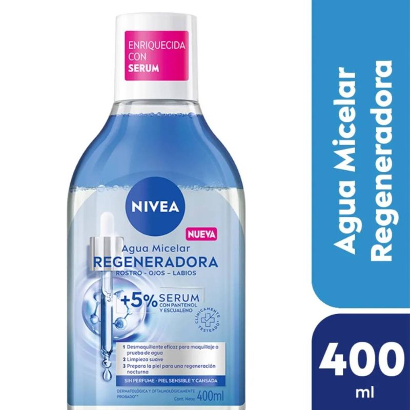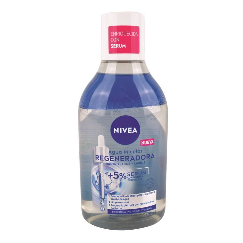 El Agua Micelar Regeneradora NIVEA para pieles cansadas y sensibles. Está enriquecida con un 5 % de suero con pantenol y escualano. Elimina eficazmente el maquillaje resistente al agua, las impurezas y la suciedad con solo unas ligeras pasadas.