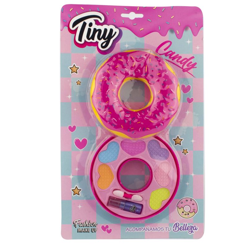 Set de maquillaje diseño dona en blíster. Viene con diferentes colores de sombras, un pequeño labial y brocha. ¡Ideales para crear looks únicos!
