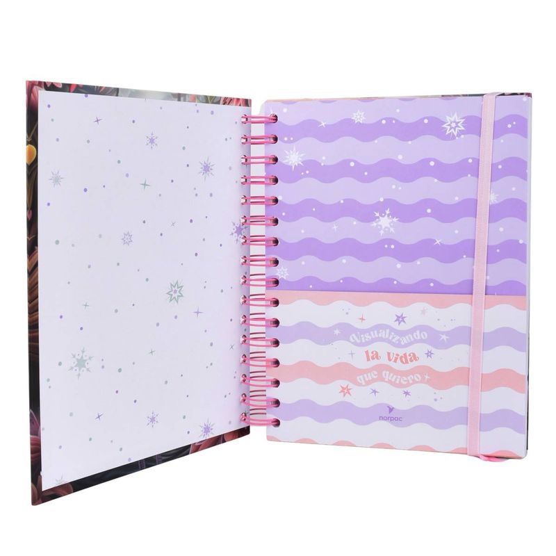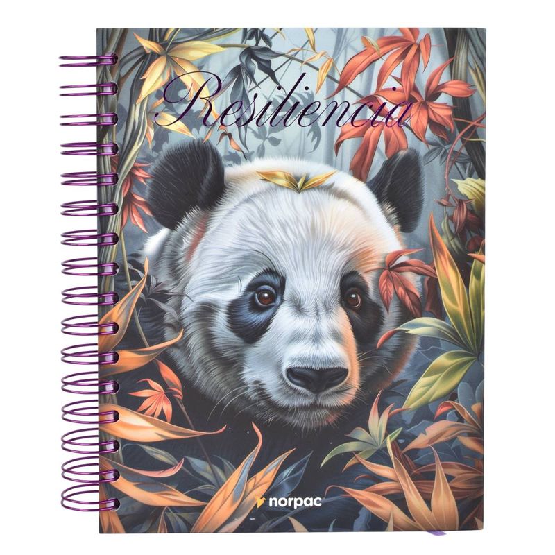Agenda Norpac de la línea Luxury N8, con un hermoso diseño de tapa dura ilustrada con arte de animales (ej. Tigre con la frase "Instinto" o Panda con la palabra "Resiliencia"). Su formato anillado y flexible permite una apertura total, ideal para la planificación diaria.