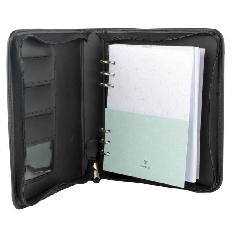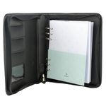 El cierre con cremallera y la solapa exterior (estuche) son los puntos fuertes en seguridad, garantizando que ninguna hoja suelta o tarjeta se extravíe. El material de la tapa exterior le otorga una sensación premium y resistencia al desgaste diario.
