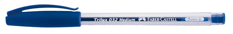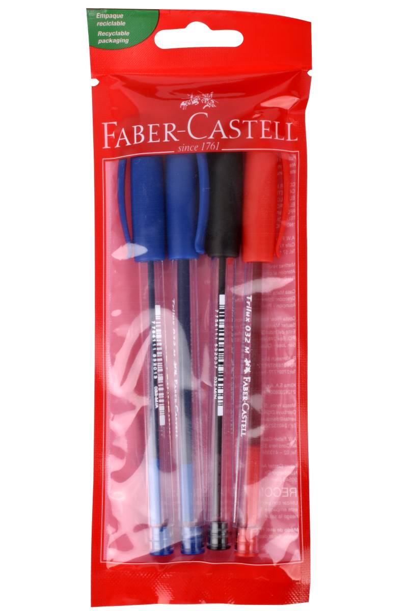 Bolígrafos Trilux Faber-Castell por cuatro unidades de color azul. Cuentan con punta metálica y un mango ergonómico transparente. Su tinta seca logra brindar acabados ultra prolijos