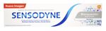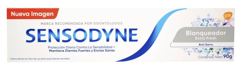 Crema dental Sensodyne con flúor, extra blanqueador. Limpia profundamente tus dientes y encías, logrando como resultado una frescura irresistible.