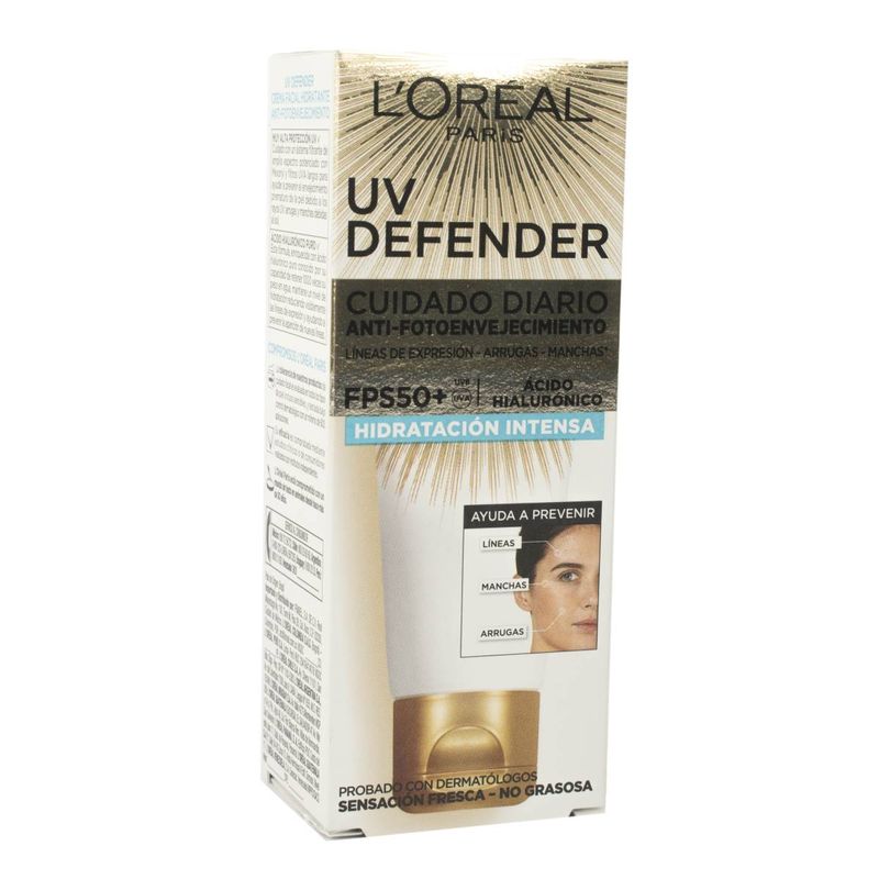 Crema facial L'Oreal protector solar de textura ligera y rápida absorción, capaz de resuguardar tu piel diariamente de los rayos UVB y UVA, máximos responsables de los signos de envejecimiento prematuro (manchas oscuras, líneas de expresión y arrugas) y del cáncer de piel. Además, mantiene tu piel hidratada gracias a su contenido de ácido hialurónico. Apto para todo tipo de piel.