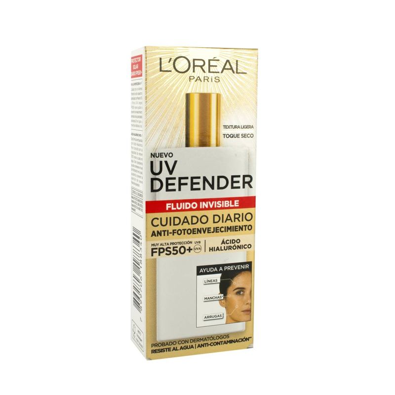 Crema L'Oreal UV. Cuidado diario con una exclusiva tecnologia combinando muy alta proteccion FPS50+ y acido hialuronico puro para defender tu piel de la exposicion diaria de los rayos UV y del envejecimiento prematuro: lineas de expresion, arrugas y manchas.