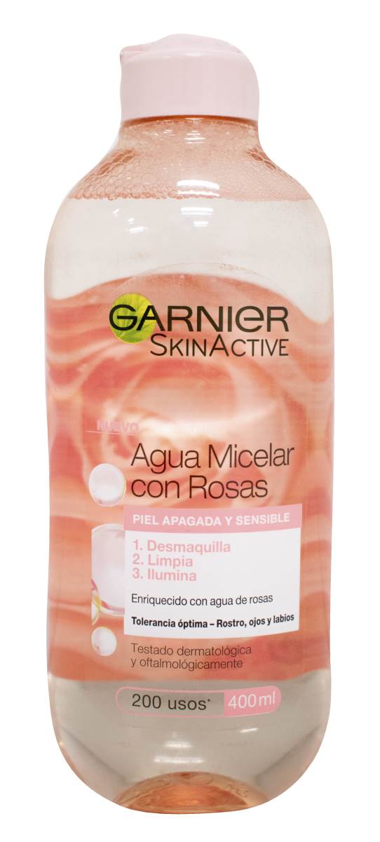 Agua micelar Garnier con rosas 400 ml. Desmaquilla, limpia e ilumina la piel sensible. Probala ahora. Comprala en Ferniplast.com.