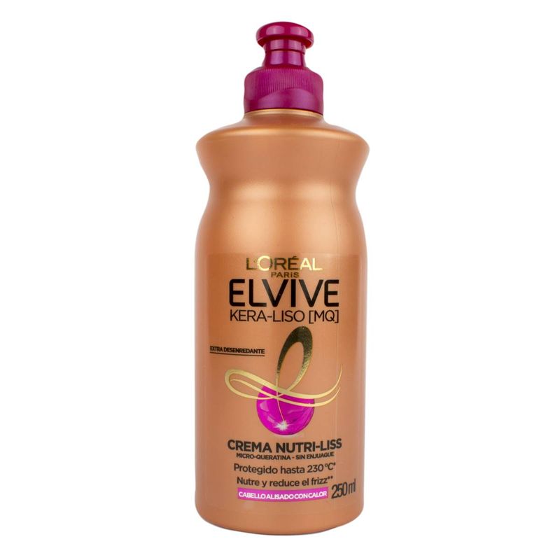 Crema para peinar Elvive Kera-Liso. Fórmula enriquecida con Micro-Queratina [MQ] inspirada en la queratina del cabello y su activo antioleosidad. Actúa en 2 niveles: hidratando el cabello sin dejarlo pesado y alisando la superficie fibra a fibra