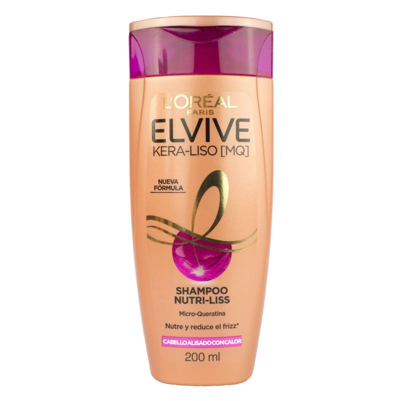 Shampoo Elvive Kera-liso MQ. Fórmula enriquecida con Micro-Queratina. Actúa en 3 niveles: Nutre el cabello, realinea fibra a fibra y protege tu pelo al alisarlo.