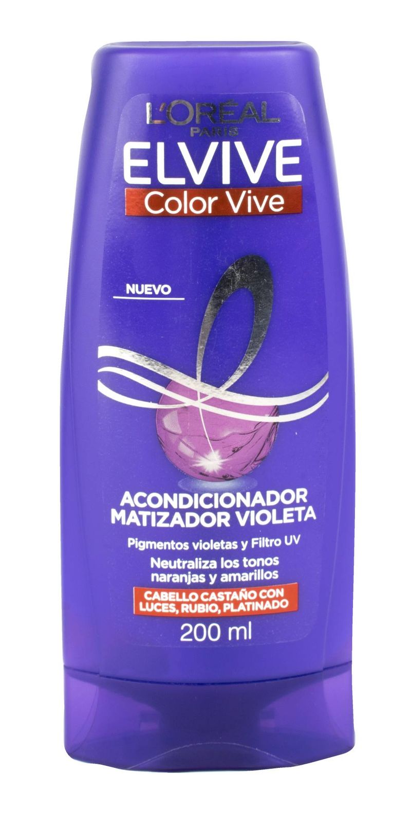 Acondicionador Elvive Color Vive Purple. Su fórmula nutre el cabello y neutraliza los tonos amarillos, naranjas y cobrizos no deseados en un solo uso, para ayudar a que el cabello se vea brillante y espléndido.