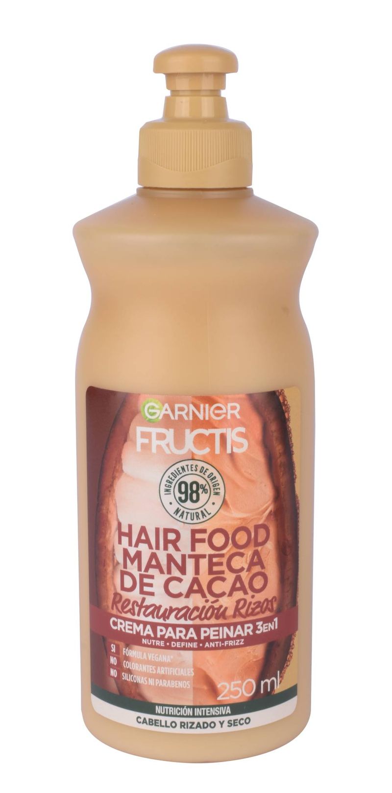La Crema Para Peinar 3 en 1 Hair Food Cacao de Fructis nutre, define y controla el encrespamiento, cuidando intensamente el cabello seco y rizado. Su fórmula vegana con 97% de ingredientes de origen natural, contiene manteca de cacao. Apto para cabellos teñidos.