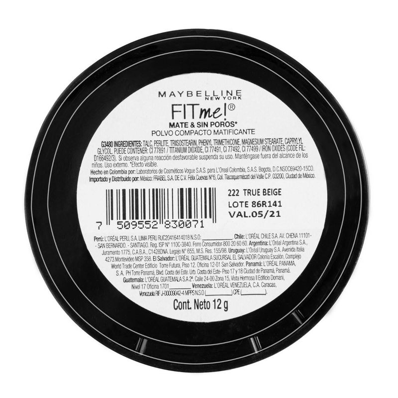 Polvo compacto Maybelline New York Fit me! Tono 222 True Beige 12gr. Matifica y minimiza los poros de tu piel. Ideal para pieles normales a mixta.