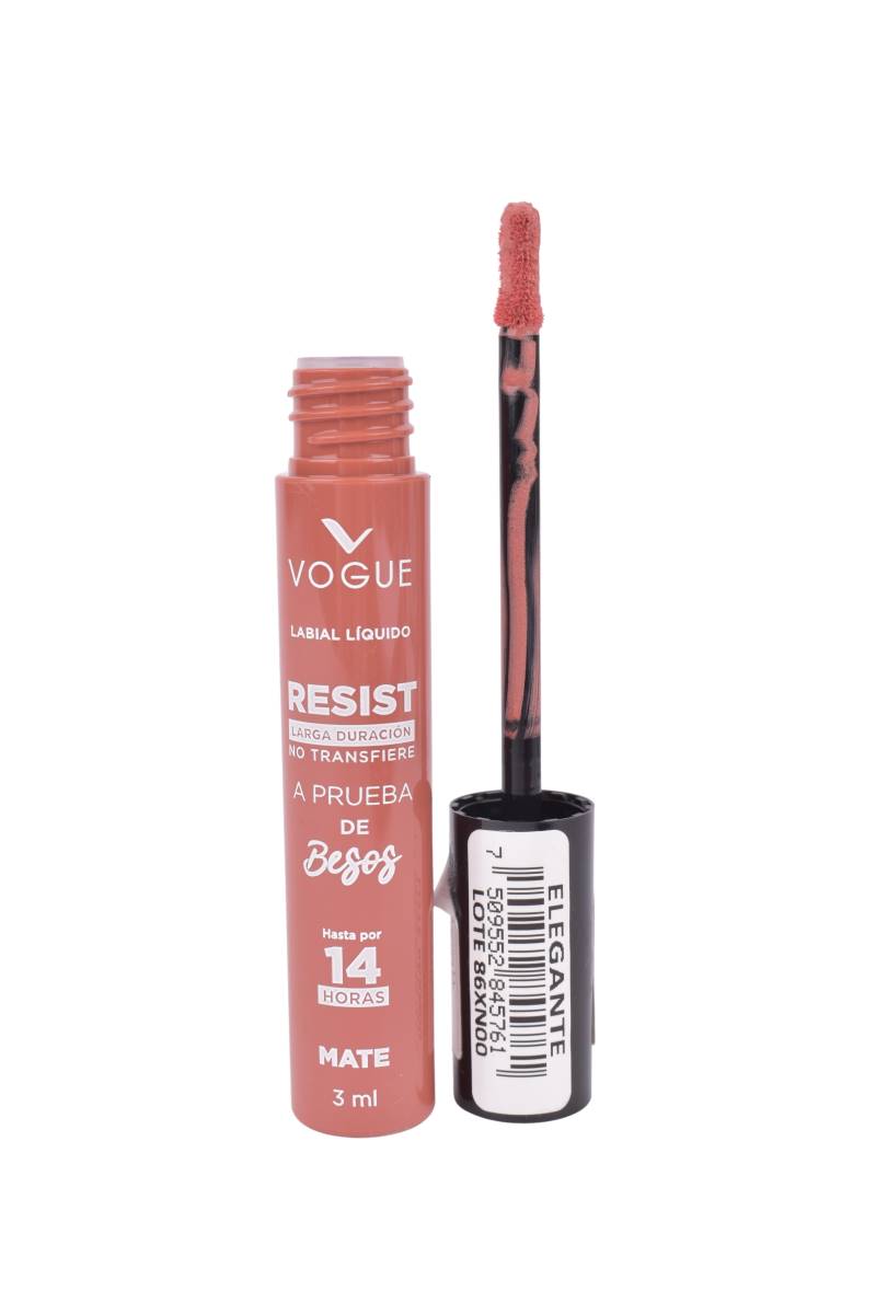 Labial líquido Vogue Resist color Elegante. Fórmula de larga duración que no se transfiere y es a prueba de besos, garantizando un color mate intenso hasta por 14 horas. ¡Labios perfectos todo el día!