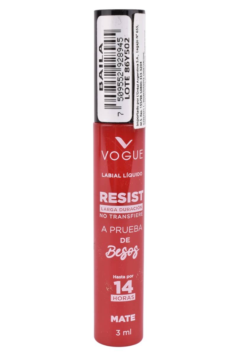 Descubre el labial líquido Vogue Resist, tu aliado perfecto para un color impecable que no transfiere. Su fórmula de larga duración promete hasta 14 horas de acabado mate, resistiendo besos y el paso del tiempo. Ideal para un look duradero y sin retoques.