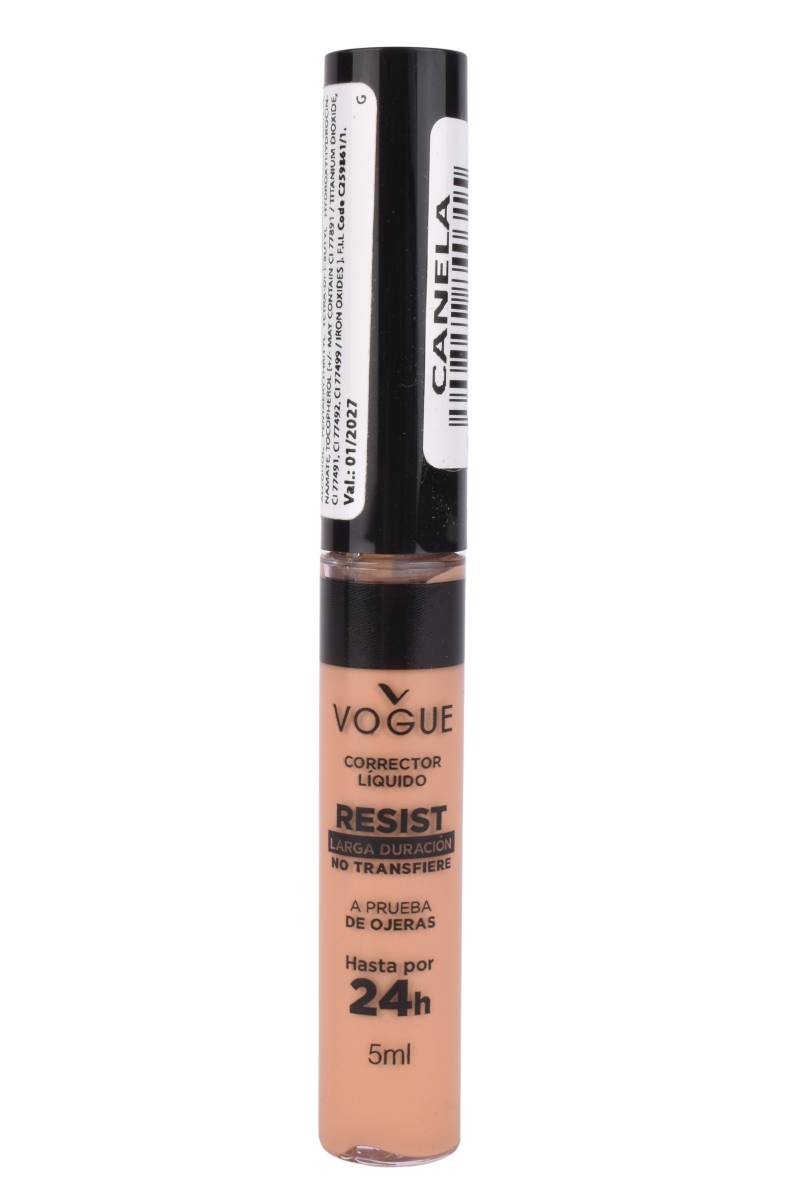 Corrector líquido Vogue Canela por 5ml, alta cobertura, sensación liguera, resiste todo el día, cobertura de arrugas.