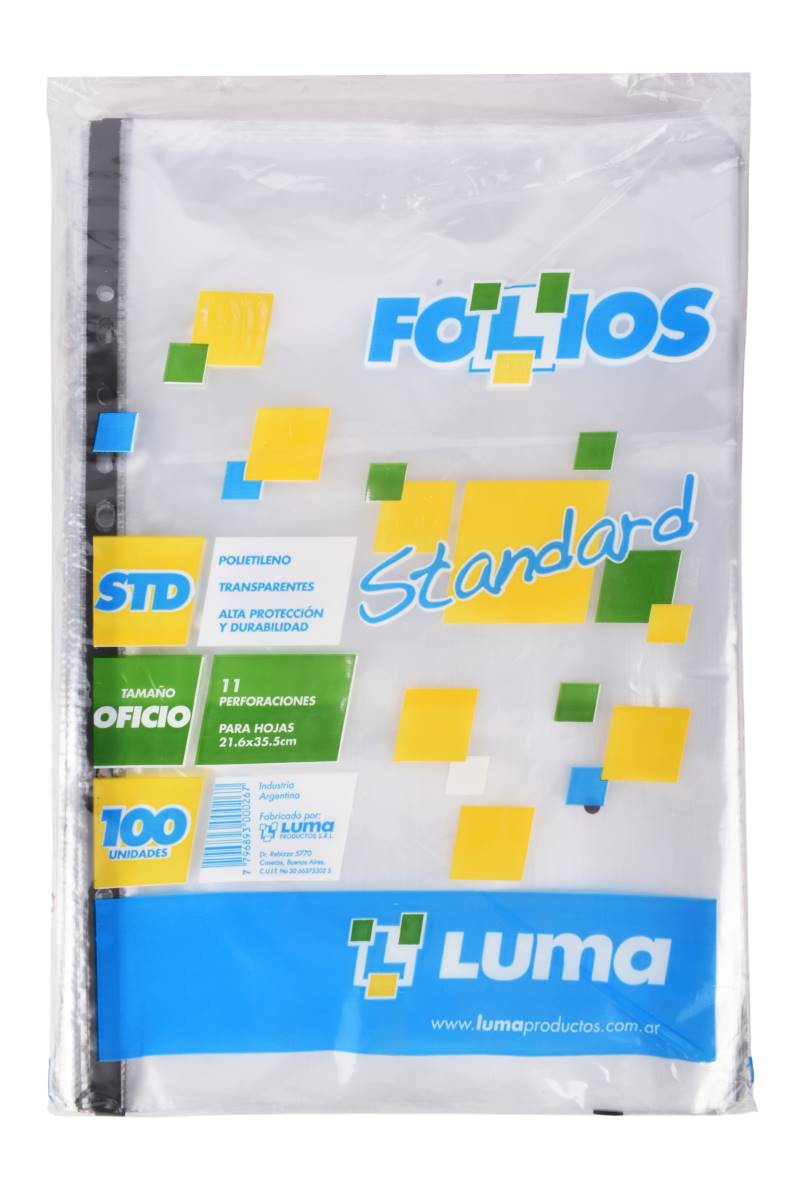 Folios Luma Standard tamaño oficio, ideales para proteger y organizar documentos en carpetas y biblioratos. Fabricados en polietileno transparente, permiten una correcta visualización del contenido sin necesidad de retirarlo. Cuentan con 11 perforaciones para un uso práctico en sistemas de archivo estándar.