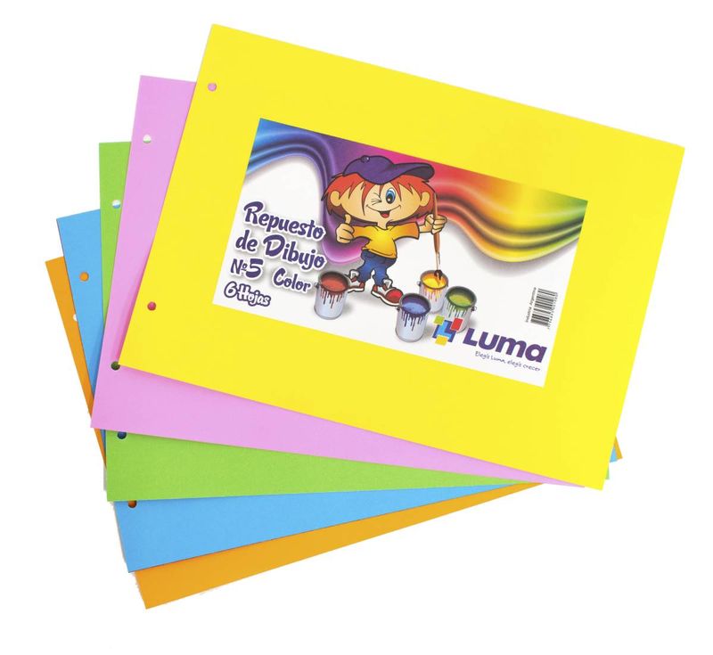 Respuesto de Dibujo Luma Nº5, contiene 6 hojas de colores surtidos, 32 cm de largo y 23 cm de ancho. Ideal para dibujar y pintar.