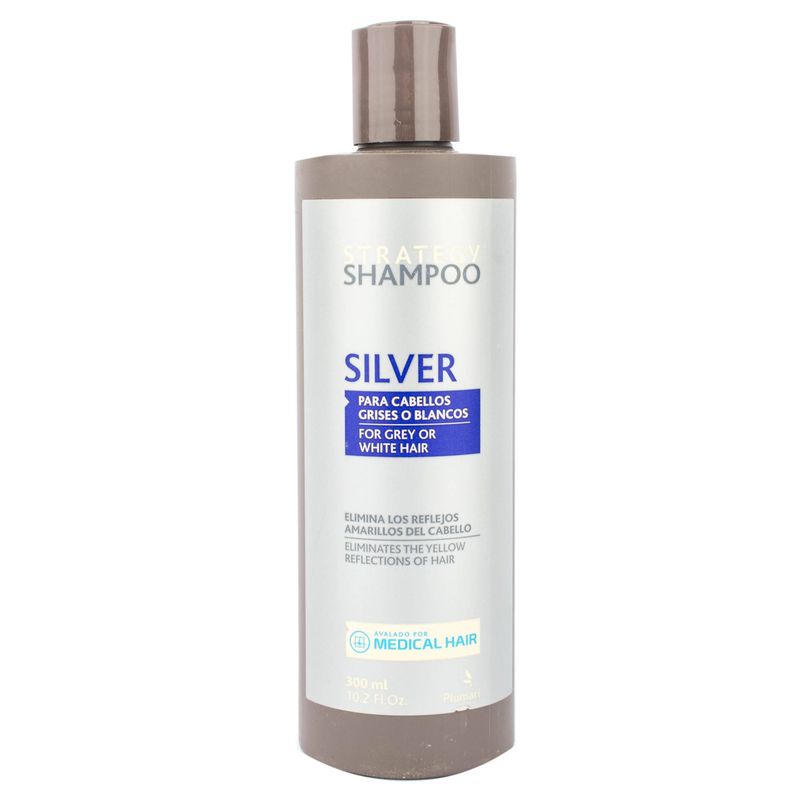 Shampoo Strategy Silver 300 ml para cabellos grises o blancos, ayuda a neutralizar reflejos amarillos y mantener el color uniforme. Cómpralo en Ferniplast.com