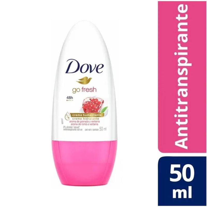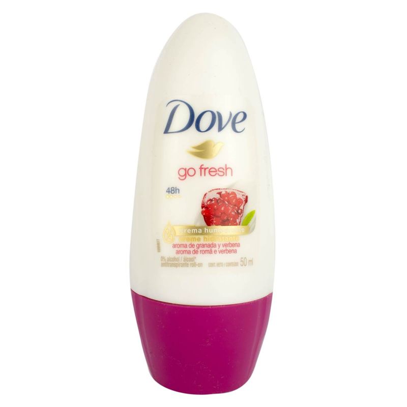Desodorante roll-on antitranspirante Dove Go Fresh, ofrece una protección de 48hs y contiene 1/4 de crema humectante. Con un exquisito aroma a granada y verbena
