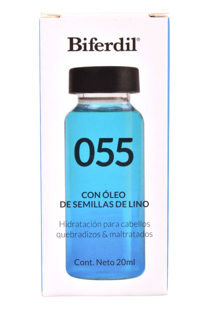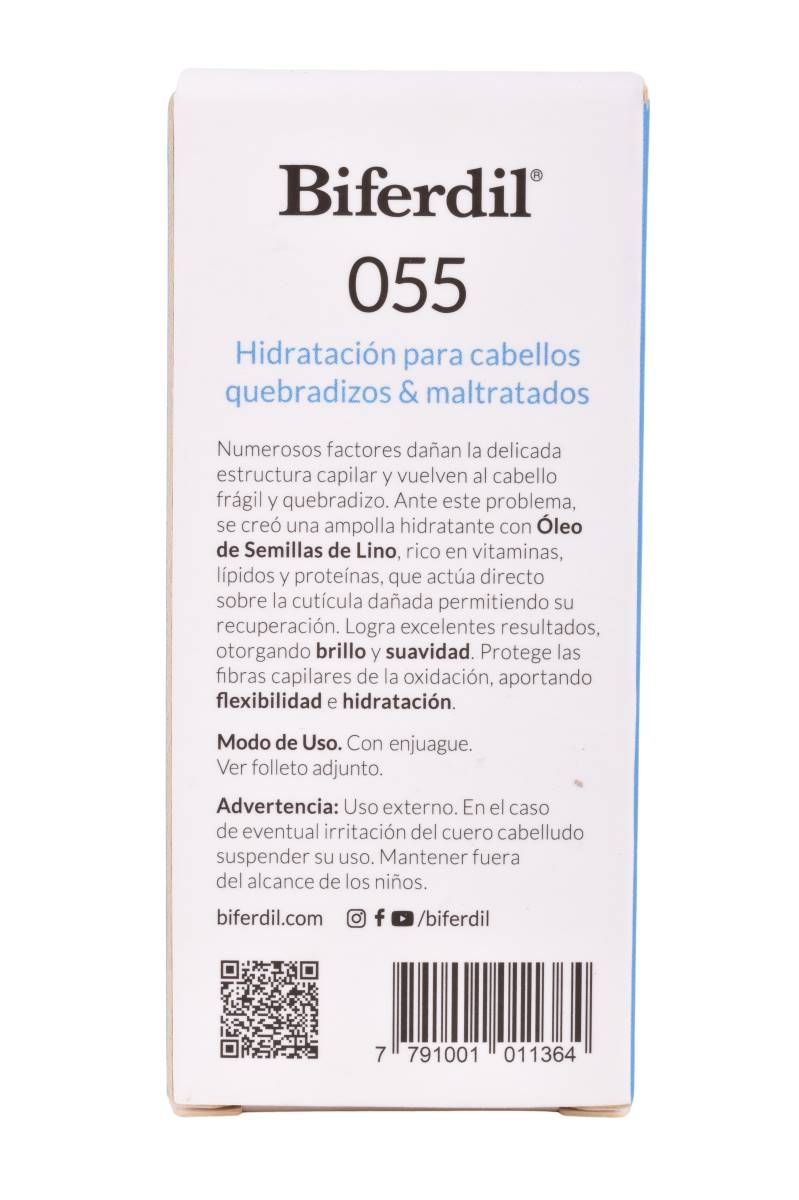 Ampolla Biferdil 055 semillas de Lino 20ml. Para cabellos quebradizos y maltratados. Restablece y protege la estructura capilar. Recupera el pH natural del cabello. Logra excelentes resultados, otorgando a los cabellos brillo y suavidad.