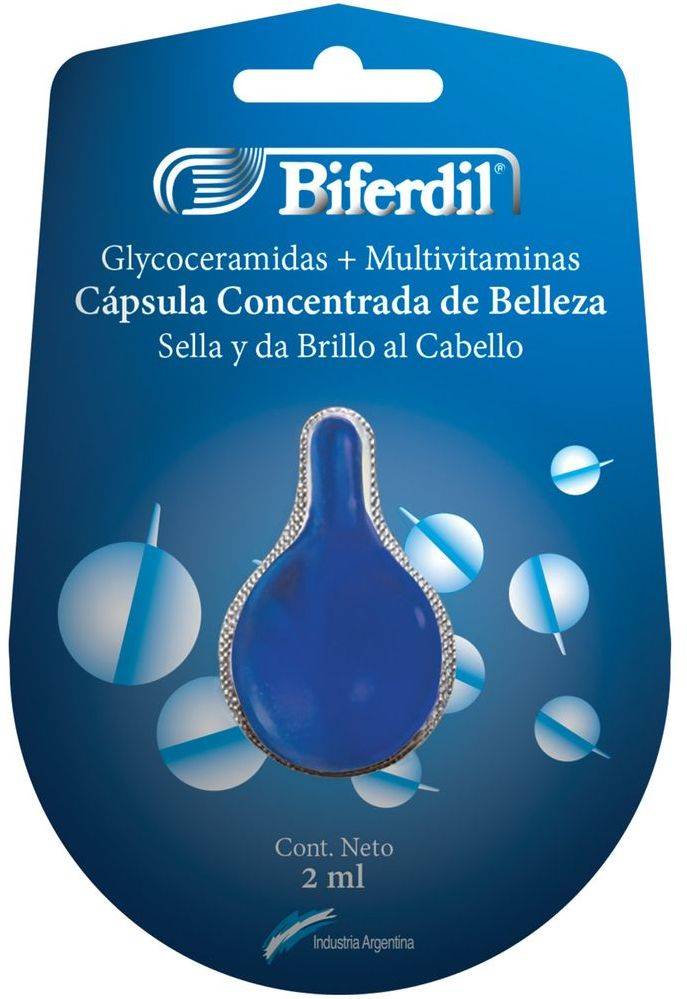 Cápsula concentrada de belleza Biferdil 2ml. Contiene glicoceramidas mas multivitaminas. Reduce el frizz y sella la cutícula del cabello dañado.