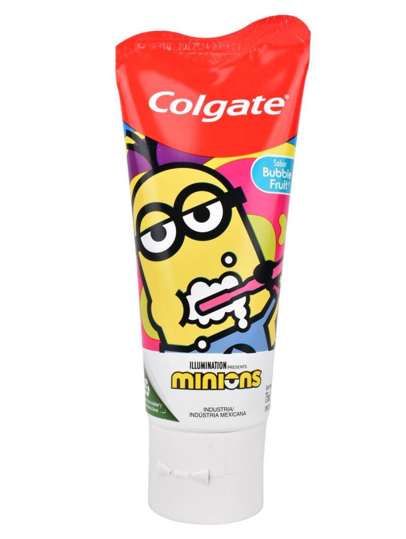 La crema dental Colgate Minions Bubble Fruit está diseñada especialmente para niños a partir de los 2 años. Proporciona protección del esmalte y de las caries, fortaleciendo y protegiendo los dientes en desarrollo. Con un delicioso sabor a bubble fruit y la temática de los Minions, este gel dental hace que el cuidado bucal sea emocionante para los más pequeños. Su fórmula incluye flúor para prevenir las caries y mantener los dientes de tus hijos fuertes y saludables