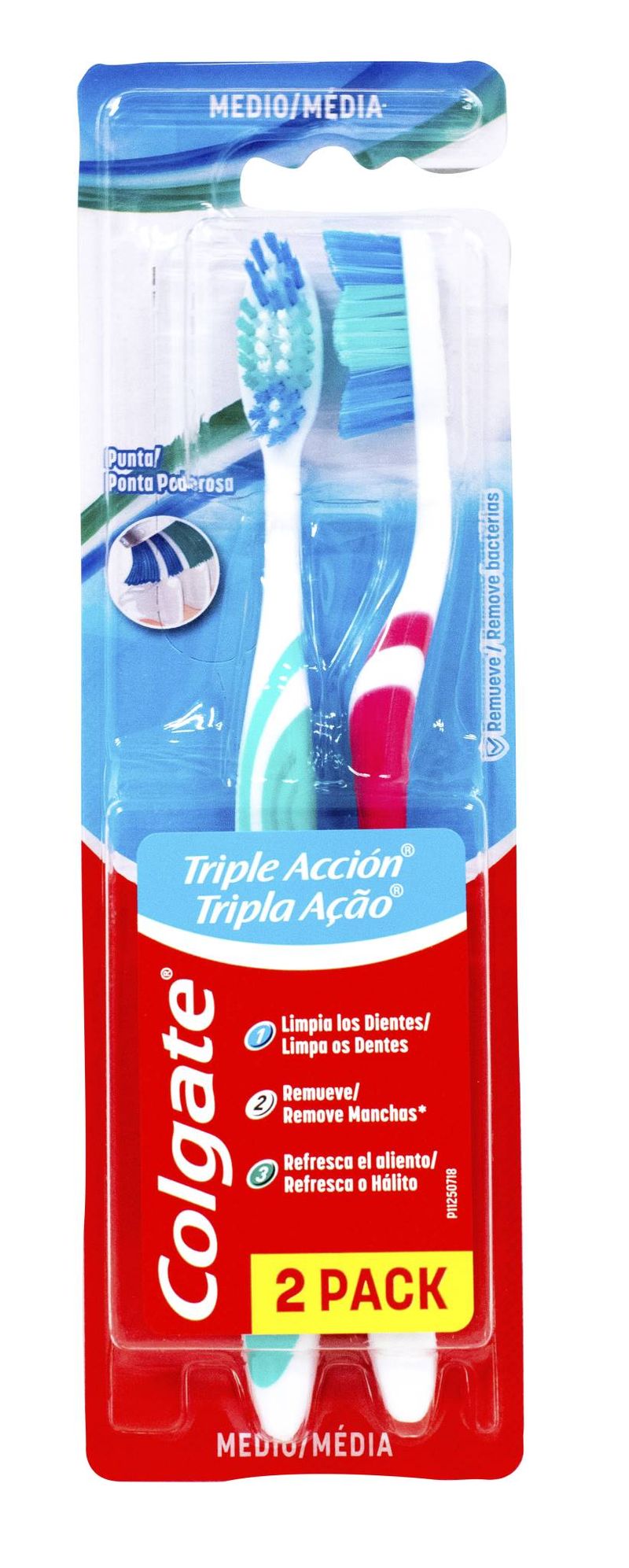 Cepillo de Dientes Colgate Triple Acción por 2 unidades. Sus cerdas están diseñadas para llegar efectivamente a cada rincón y limpiar detrás de los dientes.