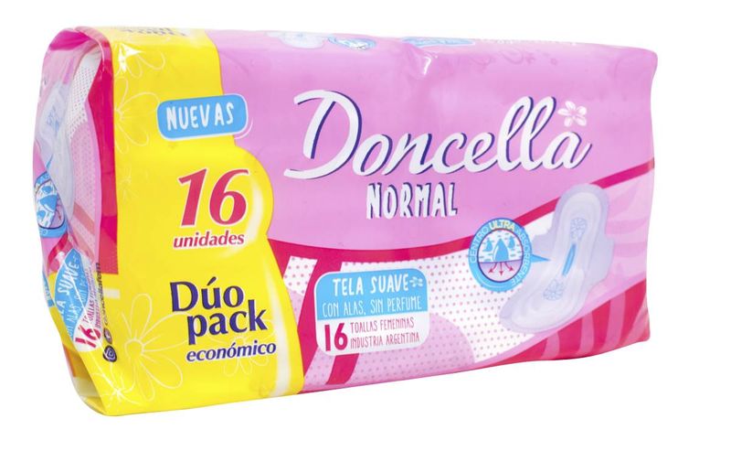 Toallas femeninas Doncella con alas sin perfume x16. Protección segura y suave para tu piel. ¡Comprá el dúo pack económico en Ferniplast.com!