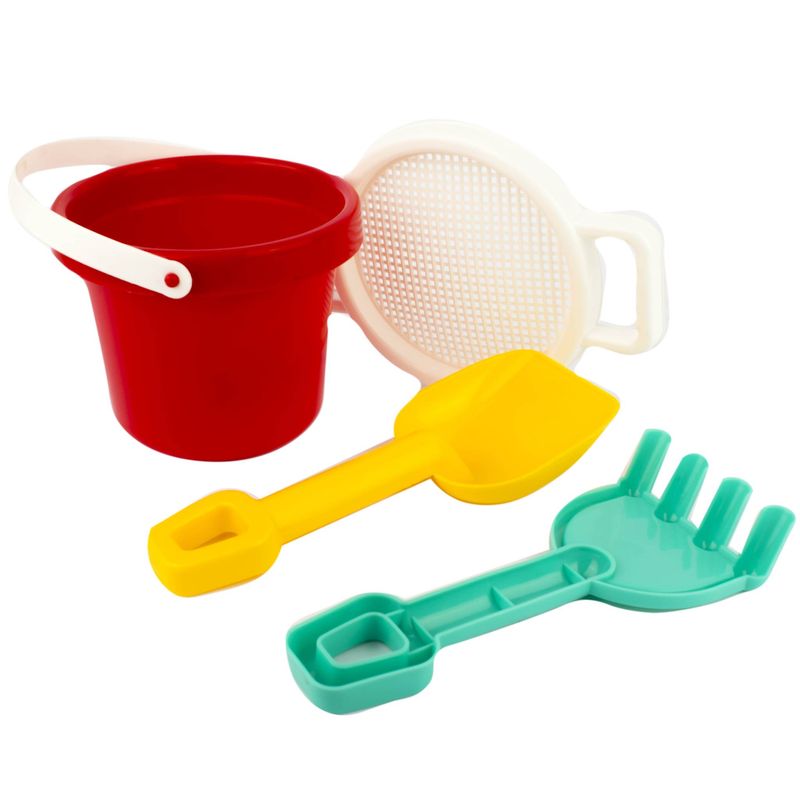 Set de playa con balde, pala, rastrillo y tamiz, ideal para jugar con arena y agua de forma divertida y segura. Perfecto para que los niños construyan castillos, tamicen arena o jueguen en la playa, pileta o patio.