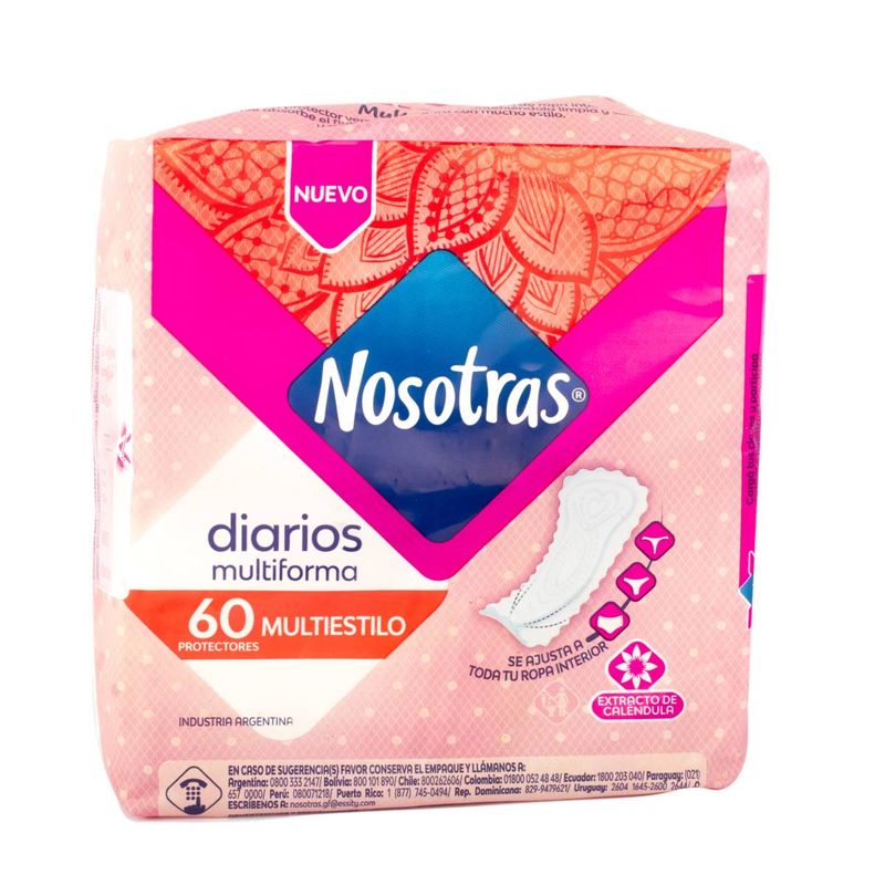 Protectores diarios Nosotras multiestilo. Su fórmula absorbe profundamente y es suave, perfecta para darte comodidad, confianza, y que estés íntimamente segura.