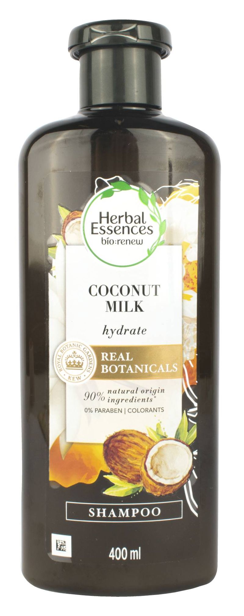 Shampoo Herbal Essences bio:renew Coconut Milk Hydrate, formulado para hidratar el cabello y dejarlo suave, con ingredientes de origen natural y fragancia a coco. Se utiliza para la limpieza e hidratación del cabello, ayudando a mantenerlo suave y manejable en la rutina diaria de cuidado capilar.