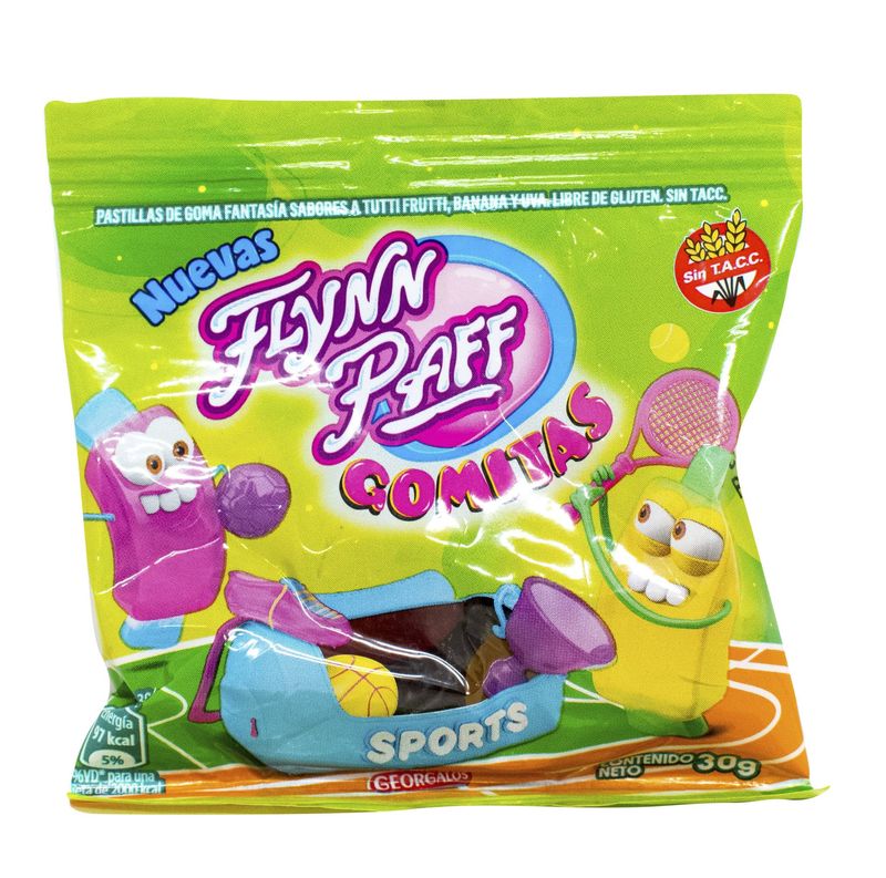 Gomitas surtidas Flynn Paff Sports, tipo caramelo marca Georgalos. Presentadas en bolsitas de 30g
