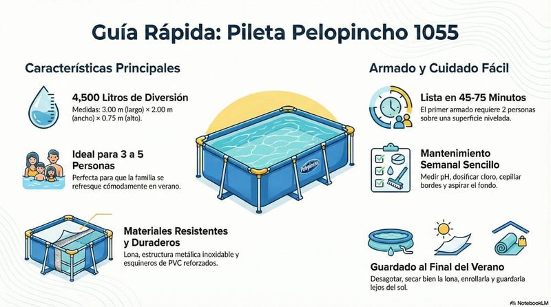 Pelopincho 1055 (capacidad de 4.500 L; 3,00 × 2,00 × 0,75 m): el salto ideal para familias que buscan más profundidad y superficie que una 1043, sin pasar a los modelos XL.