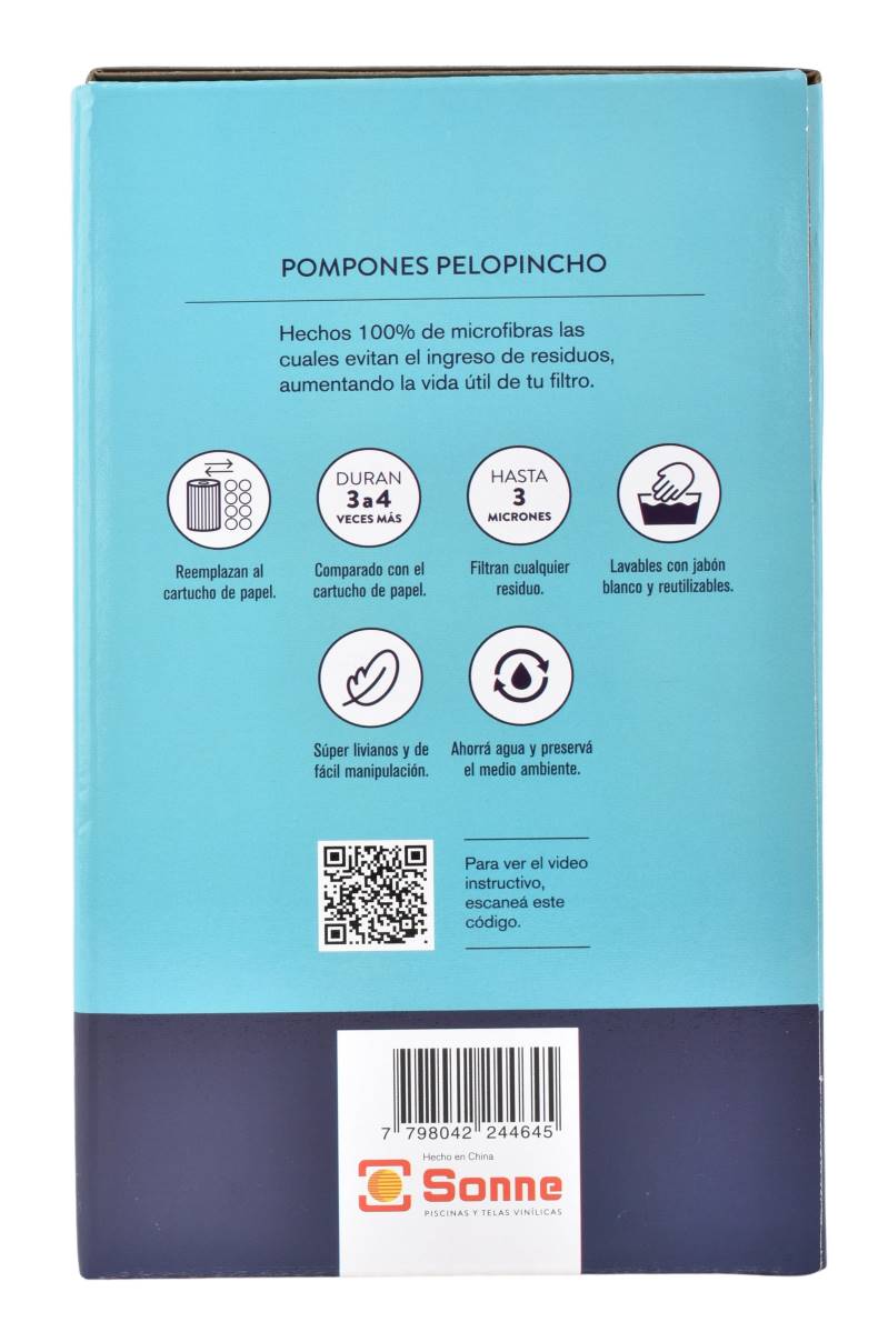 Optimizá la limpieza del agua con los pompones filtrantes Pelopincho. Reemplazan la arena del filtro con mayor eficiencia y menor mantenimiento. Filtra eficazmente el agua de la pileta, eliminando impurezas y manteniéndola cristalina con un sistema más liviano y fácil de mantener.