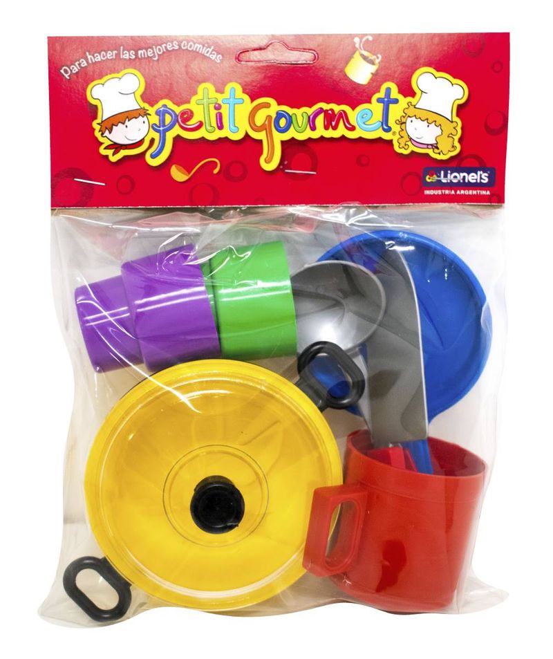 Set elementos de cocina Petit Gourmet. contiene cacerola, sárten, jarro, vasos y utensilios para hacer las mejores comidas jugando.